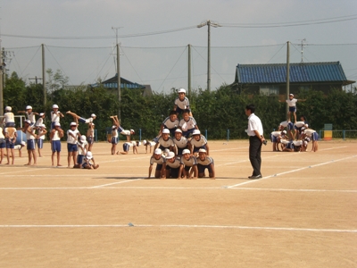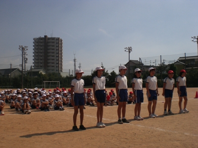 今天气温33摄氏度,没有风,正当午饭后最闷热的时候,六年级的同学们在操场上为即将召开的运动会加紧准备,个个晒得皮肤黝黑,汗流浃背。知道我们要来,个个都精神抖擞,还排出最强阵容,为我们致欢迎词。