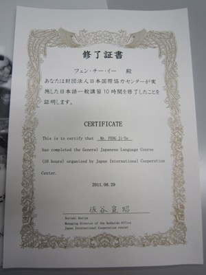 下面是我的初级日语修习证书,日文叫“修了证书”,听起来倒像是一纸“休书”。学习一点日文知识,有助于对中日文化的了解和比较,而并非像某些人认为的中国人学日文那就是上纲上线,极端民族主义的表现,伟大的周总理精通五国语言,其一就是日文。还有那些曾经感动和影响过无数中国人的日本动画片,如《咪咪流浪记》,《聪明的一休》,《机器猫》,《铁臂阿童木》……,假如你“年幼无知”已经看过了,怎么办?
