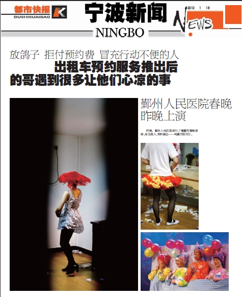 1月18日都市快报·宁波新闻头版头条隆重报道我院17日晚在邵逸夫剧院举行的2012迎春联欢晚会,这篇题为《鄞州人民医院春晚昨晚上演》的报道在第一时间向社会各界介绍了我院每年一度的文化大餐,生动的现场照片“颠覆”医务人员的传统形象,展现出了医院职工丰富多彩的文化内涵和忙中作乐的积极心态。
