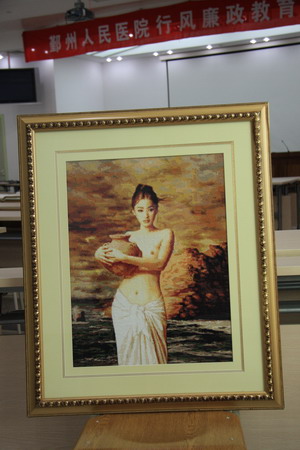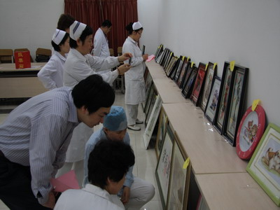 一次护士才艺作品评奖展。4月21日的上午九点,在多功能展示厅里有护士自己亲手制作的各类艺术品80多幅,最多的是刺绣,还有字画,护士手工制作的日用品,编织的毛衣,还有很多的鲜花,尤其引人注目的是还有护士用废物制作的小工艺品。观看者无不绝口称赞,最后评出了大家公认的《绣女赏花》特等奖,还评出了一等奖,二等奖,三等奖和优秀奖。