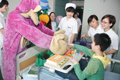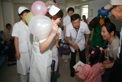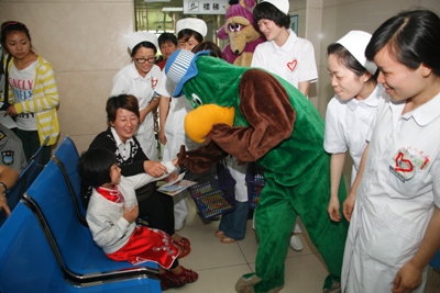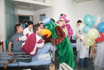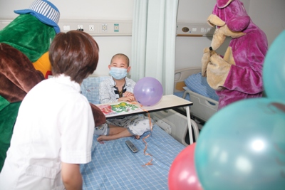 早上七点半,9名天使志愿者带着礼品,分别去了血液科、儿科病房、儿科门诊及输液大厅。每到一处,大鹦鹉与米老鼠的扮演者王建华、钟国平(实习医生),穿着厚厚的卡通外衣,将书画、气球等各种小礼物和祝福送到了孩子们及家长的手上,并与孩子们进行互动。孩子们都暂时忘却了病痛,脸上洋溢着节日的喜庆。