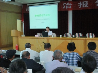 宁海希爱康复协会是以肿瘤病人为主体的协会,已建立10余年,有近600名会员。至与该协会建立联系以来,协会的会员们经常在我院治疗,对我们的医护人员的技术水平和服务态度赞赏有佳。当得知我们这次组织肿瘤放化疗和肿瘤外科的专家团队前往时,那里的会员们早早等候在会场。放疗科徐正阳和王锡恩两位主任运用临床实践中一些活生生的正反面病例,对癌症的早期表现、治疗方法、康复知识和定期随访的重要性以及中药的特色治疗等进行讲解、阐述,化深奥艰涩的医学知识为通俗易懂的语言,牢牢地吸引住了台下听讲的病友们。大家时而看着播放的幻灯片奋笔疾书做着记录,时而会心地微笑点头,个个都听得非常入神。病友尤大姐是个直心肠,她说:省里一些大医院的专家来给我们讲过几堂课,大家听到最后都要睡着了,讲的太专业了,跟听天书似的。我们已经跟会长要求了,以后就想听你们鄞州人民医院的专家来讲,大家听的兴致也高,收获也大。