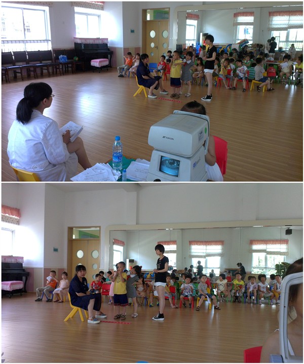 第十三站:东城幼儿园,据总务老师介绍说,东城幼儿园是一家以外来务工人员子女为多的幼儿园。上次6月3日普查的102名中班小朋友,视力低于0.8(含0.8)就有46名,低于0.6(含0.6)的20名,单眼视力< 0.1的1名,单眼视力0.1和0.15各1名。可能家长因上班时间忙,对小朋友管束的时间相对少,视力的重视程度也相对低。鄞州人民医院眼科中心提醒家长不管工作多忙,都不能忽视小朋友的视力。今天共普查81名大班小朋友,视力低于0.8(含0.8)14名,低于0.6(含0.6)7名,比中班的情况好多了。
