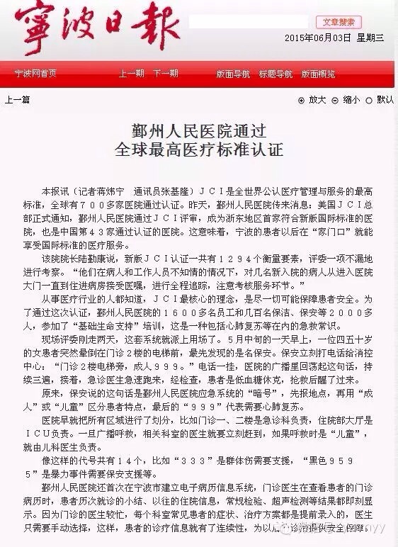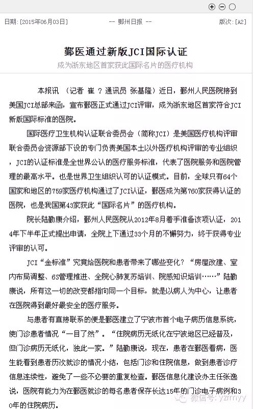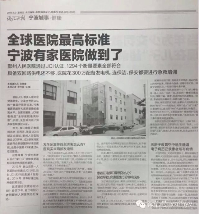 昨天,钱江晚报记者得到消息:前两天,美国JCI总部正式通知,鄞州人民医院通过JCI评审,成为浙东地区首家符合新版国际标准的医院,也是中国第43家通过认证的医院。