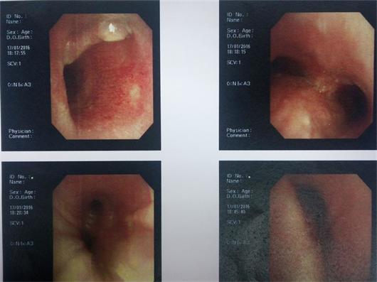 今日,我科俞万钧副院长接到外院会诊电话,有一例面瘫,脑部手术后,气道插管狭窄的患者要求转我院,进行硅酮支架的放置,解除气道狭窄。患者入住我院后异常烦躁,精神亢奋,气促,只能端坐呼吸,CT提示声门下狭窄,观察患者的耳廓有别于正常人,部分成菜花状。右侧大拇指畸形。家属自诉患者6年前因“心脏瓣膜疾病”在外院行瓣膜置换术,本次因面瘫在另一家医院行手术治疗。患者皮肤有不规则色素沉着,俞万钧副院长经认真查体,初步得出不能排除复发性多软骨炎的可能,在全麻下患者经支气管镜检查,发现全气道粘膜充血,水肿明显,粗糙,有部分肉芽肿形成,同时患者吸气相及呼气相气道容积变化明显,临床诊断为复发性多软骨炎。目前患者支气管镜下已取病理。复发性多软骨炎为罕见病,累及全身骨骼,神经,心脏,皮肤,眼等各个系统,患者6年前的心脏病及目前的面瘫均考虑此疾病引起,目前患者接受激素治疗。(徐涛)