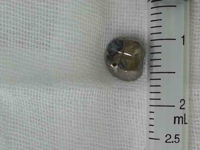 上周五,一位家住宁波市鄞州区横溪镇的农民因在进食时出现金属牙套松动,不慎掉入气管,当时就出现剧烈咳嗽,气促,胸闷等症状,难以忍受,痛苦不堪,当地医院紧急联系我科,我科由俞万钧副院长亲自操作,在支气管镜下经过不到20分钟,顺利取出牙套,解除患者痛苦,患者及家属感激万分。