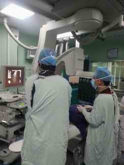 近日,呼吸科和放射介入科,麻醉科,病理科合作,在DSA室为一纵膈淋巴结肿大患者进行了超声支气管镜检查及淋巴结活检,术前,由麻醉师为患者进行全麻,术中俞万钧副院长在本科及介入科医师的协助下为该患者进行了淋巴结活检,病理科随后取材镜检,证实找到癌细胞。患者诊断明确,确诊肺癌伴纵隔4组,7组,10组淋巴结转移。我科近年来和我院各科进行了广泛合作,在疑难疾病诊断和治疗上取得了很大进展,技术水平得到了进一步提高。(徐涛)
