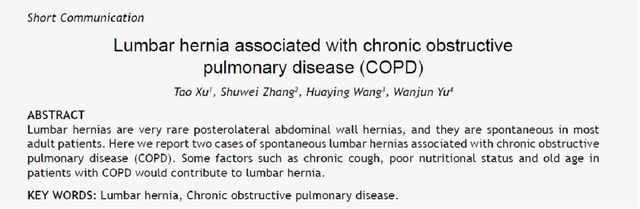 近日,我科又一篇文章被国际SCI文章录取。这篇文章由俞万钧副院长为通讯作者,徐涛副主任医师为第一作者,首次描述了临床上罕见的腰疝与COPD的关系,目前国际上无类似文章。
