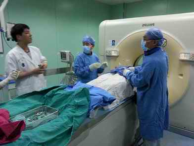 近日,我科邀请浙江省肿瘤医院放射介入科的俞炎平主任,共同为一高龄的肺癌晚期患者实施了放射性粒子置入术。该患者体检发现左胸巨大肿块,活检确诊肺癌,且已转移至胸壁,丧失了手术的机会。我科经过多次科室及院内讨论,最终决定为该患者进行姑息介入治疗,在CT室,介入科的帮助下,我科顺利完成了手术,在肿瘤内置入放射性粒子。放射性粒子置入术安全,简便,效果满意,是肿瘤介入治疗的主要手段之一。(徐涛)