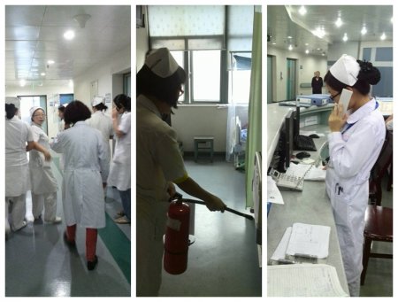 9月22日15时,7病区病房内病人们正在安静的接受治疗,护士们正在忙碌的工作。突然,14号病房传来一声惊叫,不一会儿就看到1名护士扶着病人走出了病房,大声告诉护士站的护士:“14床手机着火了”。于是,医生护士们有的打电话报警,有的去灭火,有的疏散病人,一切工作有条不紊的进行中。等到刘旭辉副主任熟练的关闭氧气阀门,关上防火门,陆滢主任宣布:“7病区消防演练结束。”