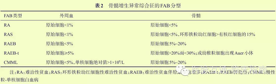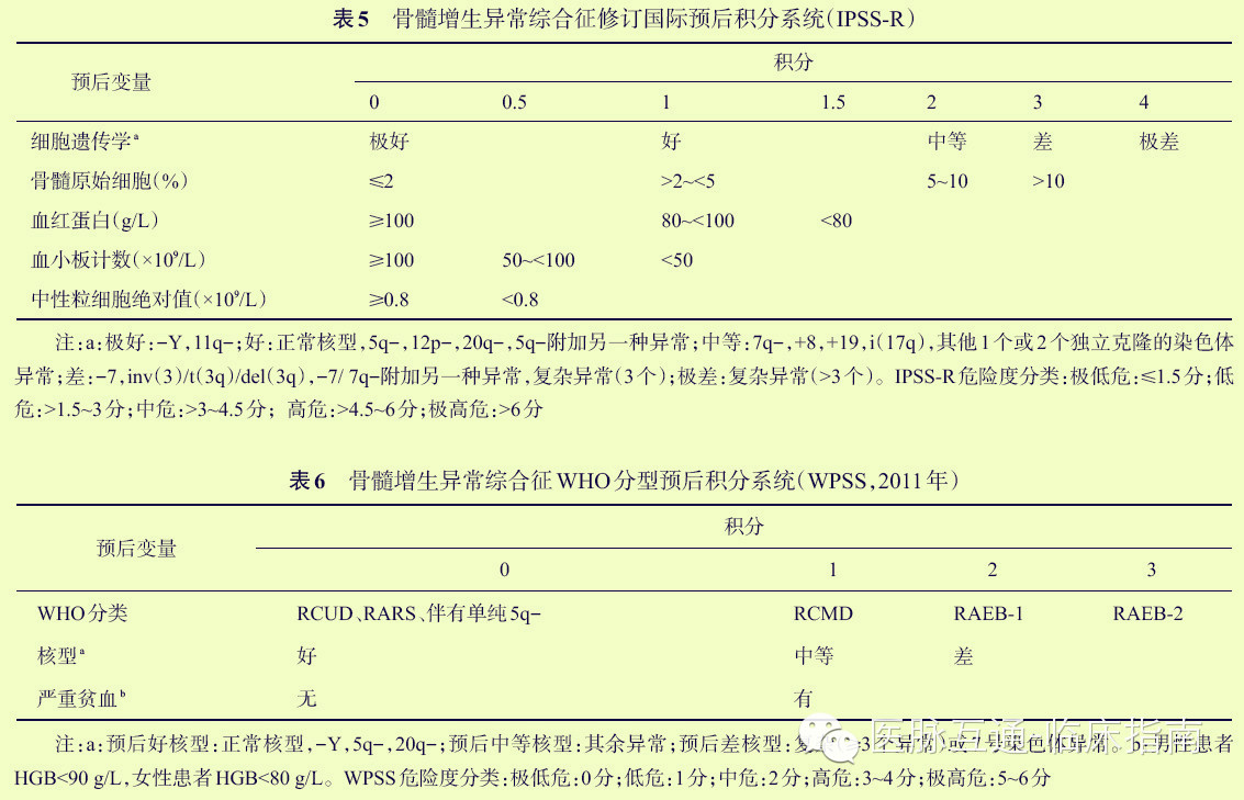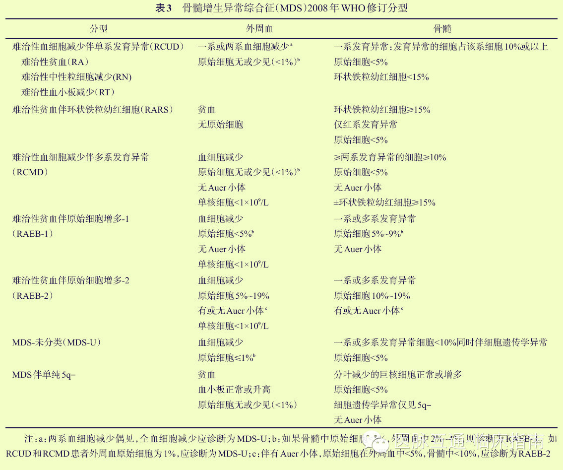 (2)确定标准:①发育异常:骨髓涂片中红细胞系、粒细胞系、巨核细胞系中发育异常细胞的比例>10%;②环状铁粒幼红细胞占有核红细胞比例多15%;③原始细胞:骨髓涂片中达5%~19%;④MDS常见染色体异常。