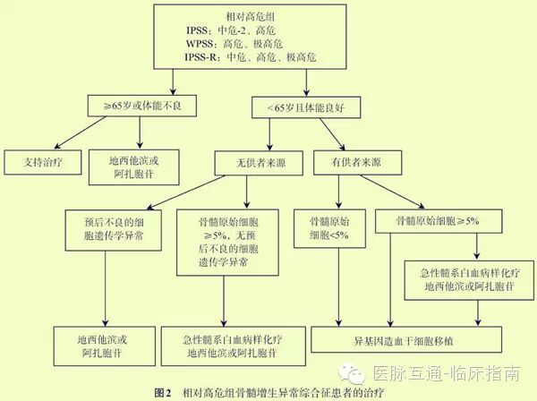 5. allo-HSCT:allo-HSCT是目前唯一能根治 MDS 的方法,造血干细胞来源包括同胞全相合供者、非血缘供者和单倍型相合血缘供者。allo-HSCT的适应证:①年龄<65岁、相对高危组MDS患者;②年龄<65岁、伴有严重血细胞减少、经其他治疗无效的巾低危患者。拟行allo-HSCT的患者,如骨髓原始细胞>5%,在等待移植的过程中可应用化疗或联合去甲基化药物桥接allo-HSCT,但不应该耽误移植的进行。