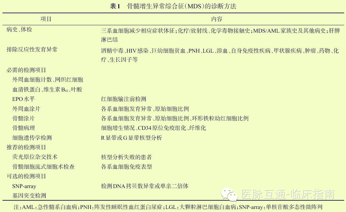 2.. MDS的诊断方法:MDS诊断依赖于多种实验室检测技术的综合使用,其中骨髓细胞形态学和细胞遗传学检测技术是MDS诊断的核心。MDS的主要诊断方法见表1。