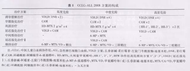 (二)化疗方案组成:ALL 治疗方案日趋成熟,治疗策略、原则大致相同,在此推荐 CCLG-ALL.2008 方案(表 1)。