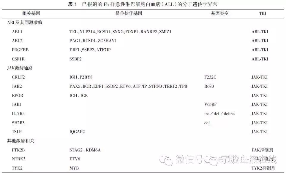 Ph样ALL患者用常规方案治疗预后差,因大多数患者有ABL或其同源激酶或JAK激酶通路的异常活化,应用ABL或JAK激酶抑制剂可帮助改善疗效。参与融合的激酶基因种类的不同,使携带不同融合基因的Ph样ALL肿瘤细胞分别对不同的TKI有效(表1):伊马替尼对 ABL1、ABL2、PDGFRB、CSF1R易位有效,JAK抑制剂鲁索替尼对JAK2易位有效,克唑替尼则对ETV6-NTRK3易位有效。