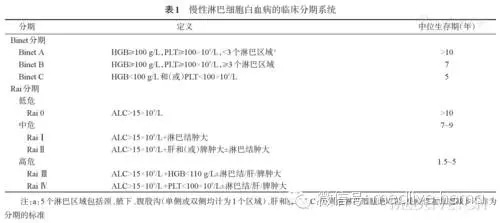CLL患者的中位生存期约10年,但不同患者的预后呈高度异质性。性别、年龄、体能状态、伴随疾病、外周血淋巴细胞计数及倍增时间,以及乳酸脱氢酶(LDH)、β2微球蛋白(β2-MG)、胸苷激酶1(TK1)等临床和实验指标是重要的传统预后因素。而临床上评估预后最常使用Rai和Binet两种临床分期系统(表1)。这两种分期均仅依赖体检和简单实验室检查,不需要进行超声、CT或MRI扫描等影像学检查。