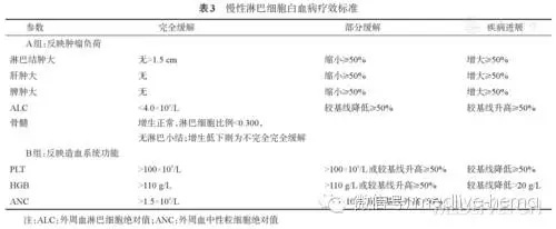 在CLL患者的治疗中应定期进行疗效评估,诱导治疗通常以6个疗程为宜,建议治疗3~4个疗程时进行中期疗效评估,疗效标准见表3。