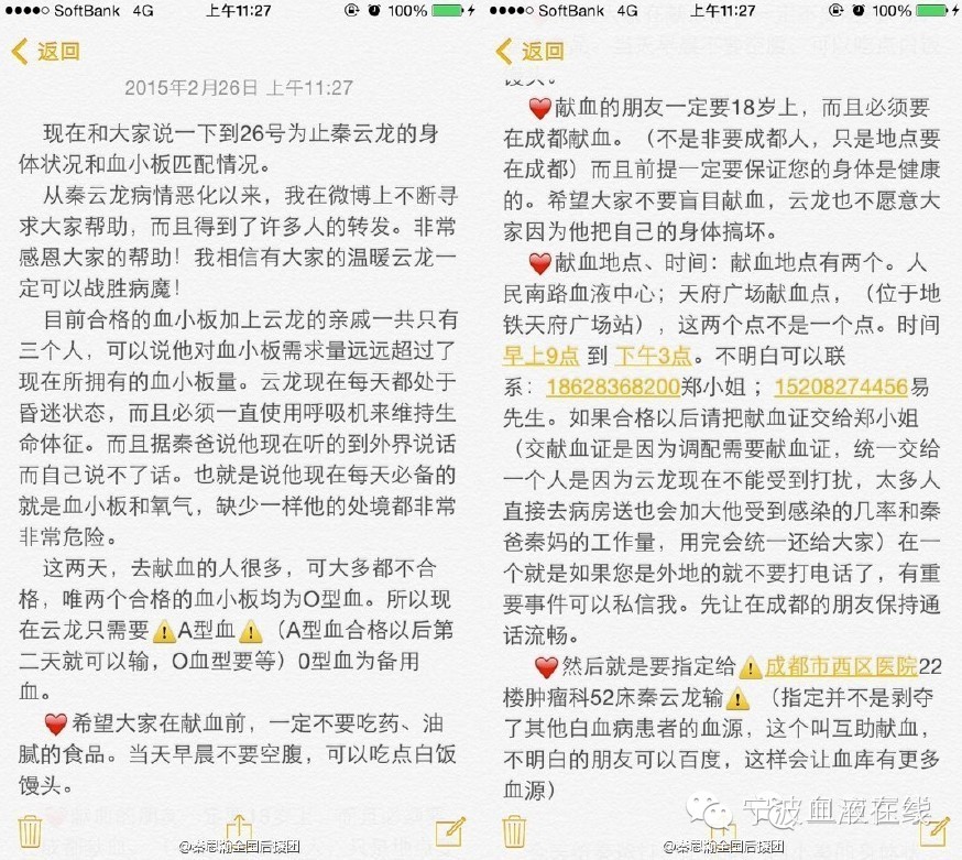 (“成都最帅交警”秦云龙因患白血病化疗后血小板低下,家属在微博求助,寻找互助捐献血小板的有心人。令人遗憾的是,秦云龙终因病情恶化,在3月8日离开了人世。)