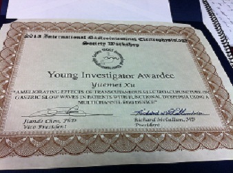 6月18日,我院消化内科徐月梅主治医师受国际胃肠电协会的邀请至美国奥兰多参加了国际胃肠电年会,在会议上做了《Promoting Effect Of Transcutaneous Electroacupuncture On Gastric Slow Waves In Patients With Functional Dyspepsia Using multichannel EGG Device》的专题报告,并获得了“Yong Investigator Awardee”奖。国际胃肠电协会是一个致力于胃肠电、胃肠生理、胃肠动力研究的专业性协会,该协会每年举行一次,探讨胃肠动力学研究的进展,并评审该年度的优秀胃肠动力研究报告。