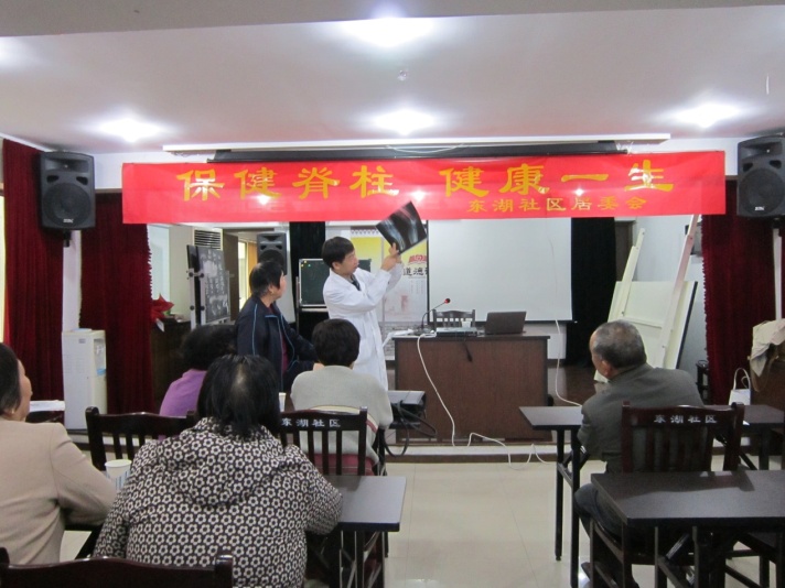 园二期社区文明学校内举行“保健脊柱。健康一身”健康讲座,期间在座的居民踊跃向王主任提出脊柱