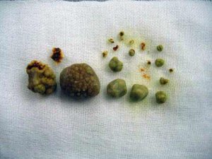 当结石被卡在胆管中时,会使腹部右上方或肩胛骨间发生剧痛。如果结石又落回胆囊里,或者是强行通过胆管进入肠小,造成绞痛的阻塞原因消失,疼痛也就会消退。如果胆结石卡在胆管里一段时间,它会阻塞胆汁的出路,造成阻塞性黄疽。如果胆汁的出路被阻塞,另一种危害就是胆汁潴聚,造成胆囊发炎甚至感染,胆结石还易诱发胰腺炎。结石还可能引起胆囊或胆管的瘤变。胆结石患者中,女性明显多于男性,并常见于40岁以上的肥胖者。